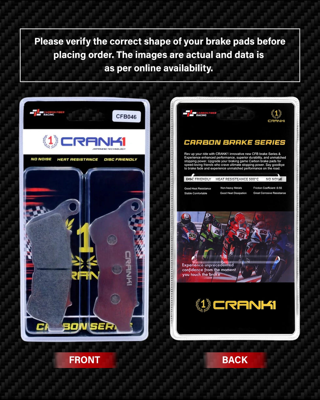 By upgrading to CRANK1 Carbon Brake Pads, you enhance your motorcycle’s braking performance, safety, and riding comfort.
